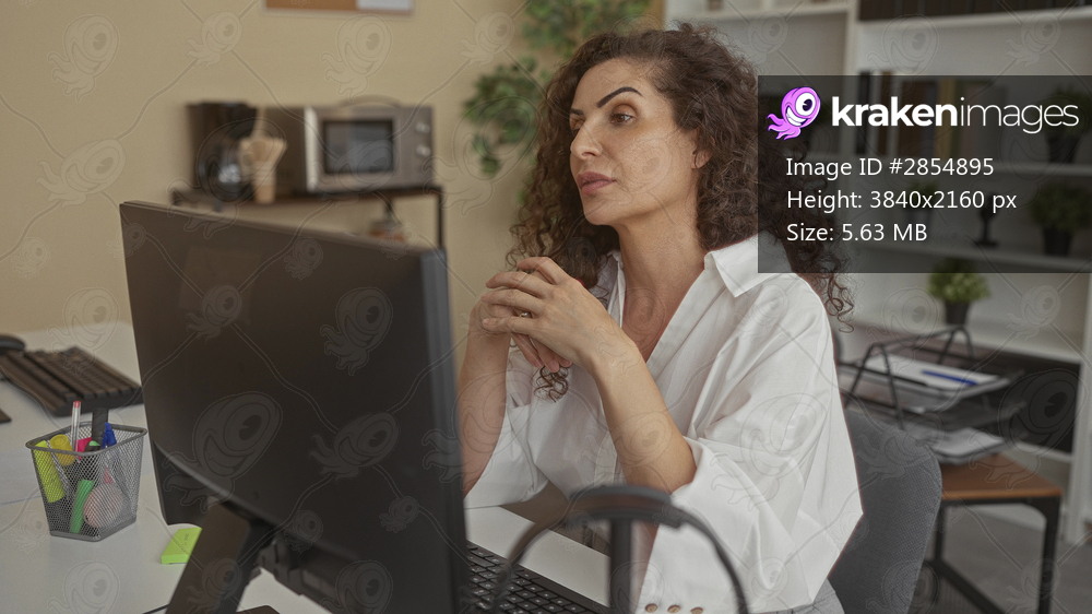 Young hispanic woman leans forward with clasped hands at computer monitor in building; concentration collaboration.