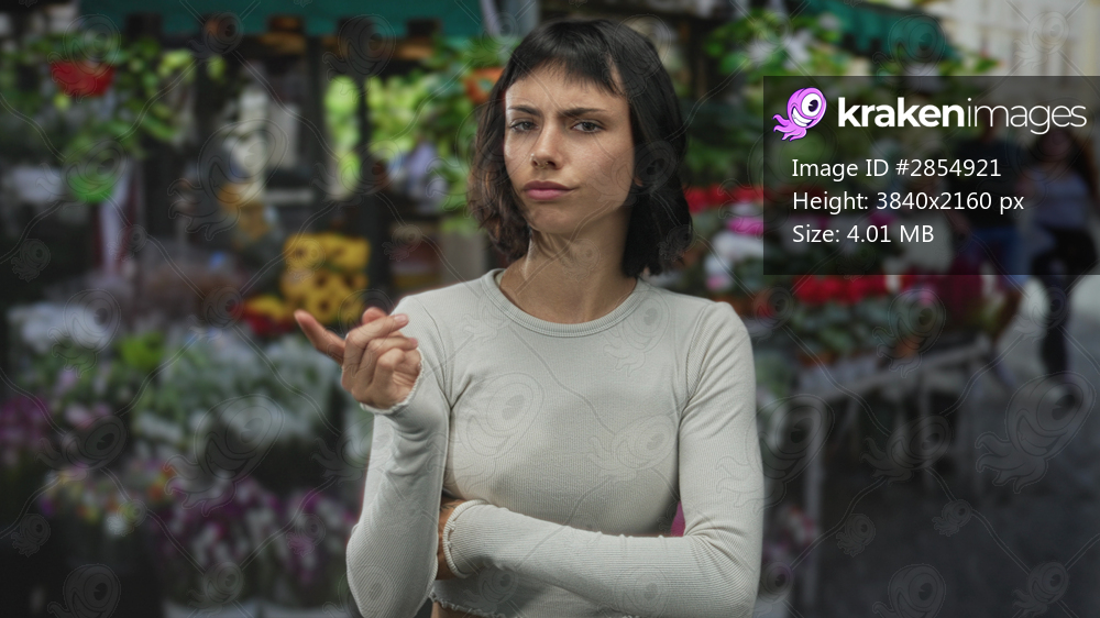 Young hispanic woman lifts index finger amid vibrant flower bouquets at a street market; disapproval.