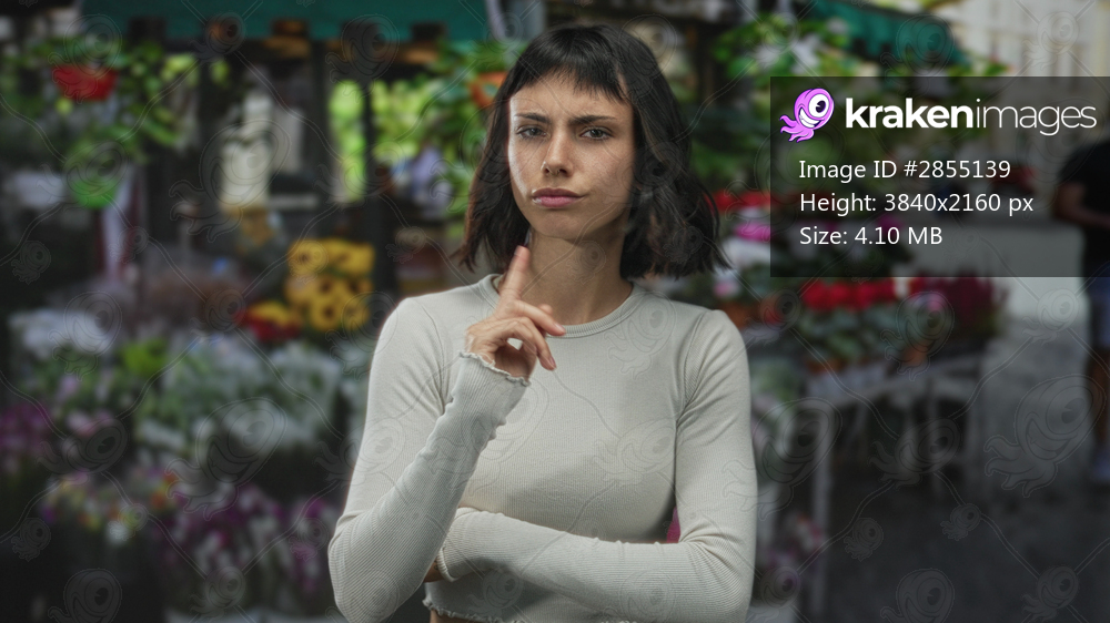 Young hispanic woman lifts index finger amid vibrant flower bouquets at a street market; disapproval.