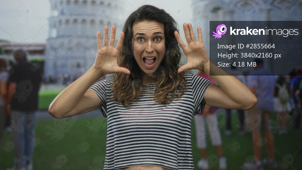 Young hispanic woman lifts open palms at leaning tower building in crowded piazza under bright sunlight; joy travel.