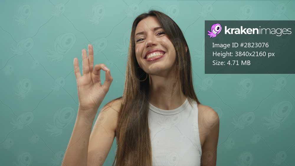 Young hispanic woman with long brown hair makes ok sign in a teal studio set and smiles broadly; approval confidence.