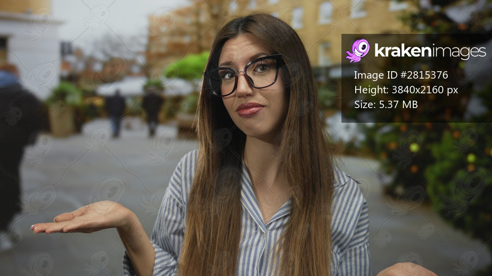 Young hispanic woman with long brown hair and oversized glasses raises palms on busy city street; confusion.
