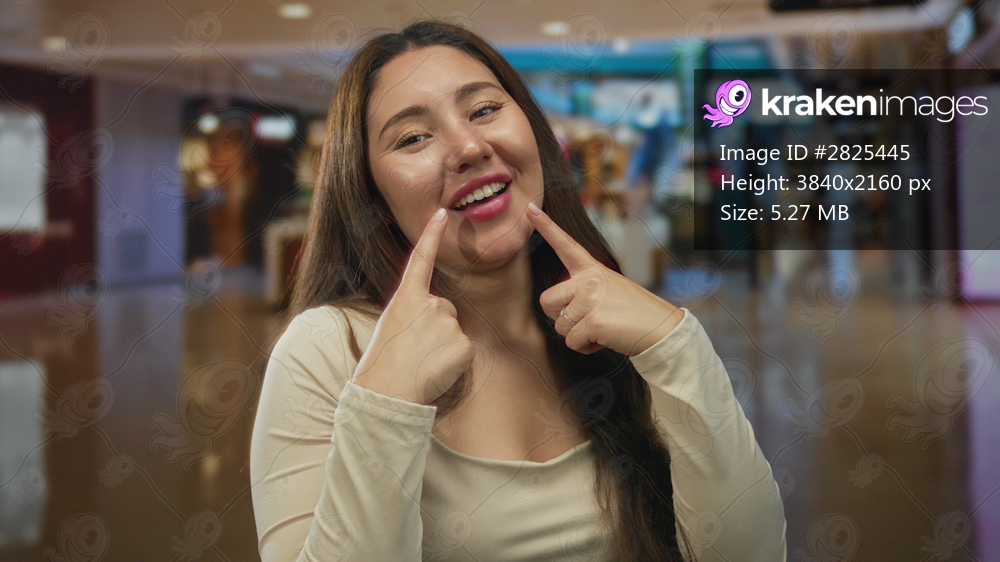 Young hispanic woman with long brown hair pointing finger to lips at indoor shopping mall center; confidence joy happiness positivity.