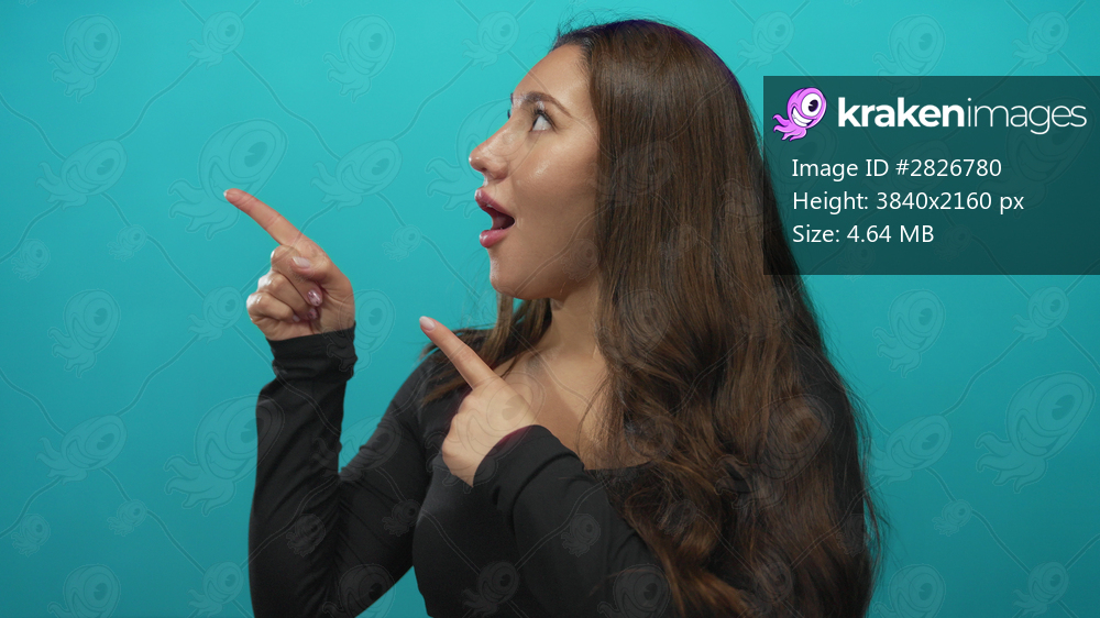 Young hispanic woman with long brown hair pointing finger to object in studio against a turquoise wall with slightly open mouth; surprise curiosity discovery wonder. - Kraken Images