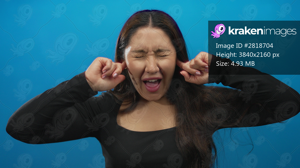 Young hispanic woman with long dark hair covers ears with hands on a vibrant blue studio set; annoyance.