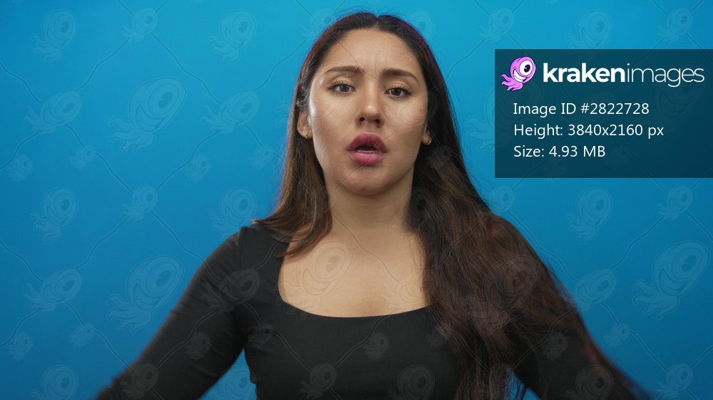 Young hispanic woman with long dark hair covers ears with hands on a vibrant blue studio set; annoyance.