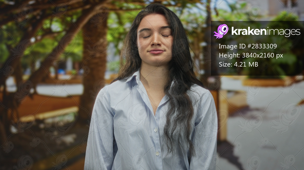 Young hispanic woman with long dark hair in striped shirt winks eye on leafy sunlit street corner; boredom.
