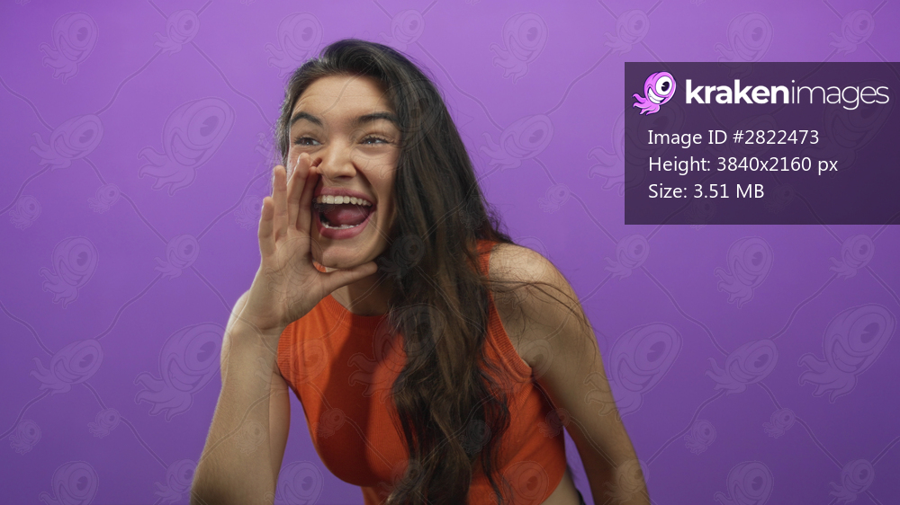 Young hispanic woman with long dark hair pressing hand to mouth shouting in a studio setting with a purple backdrop while wearing an orange top; enthusiasm. - Kraken Images