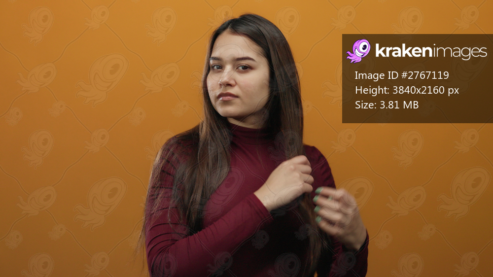 Young hispanic woman with long hair brushing with hand against orange background,intensely examining hair ends for split hair care concept.