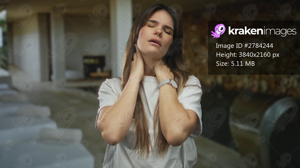 Young hispanic woman with long hair in a white shirt appears to feel neck discomfort in a modern indoor hotel setting.