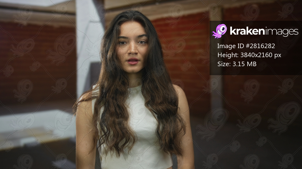 Young hispanic woman with long hair and visible face looking at camera in building interior under construction; serenity.