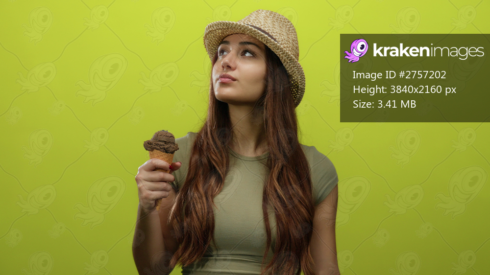 Young hispanic woman with long hair wearing a hat holding chocolate ice cream against a vibrant yellow background with a thoughtful expression