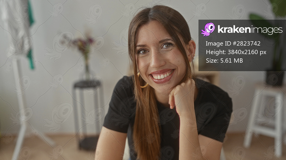 Young hispanic woman with long hair wearing black shirt rests chin on hand in studio with blurred plant beside her; quiet contemplation.
