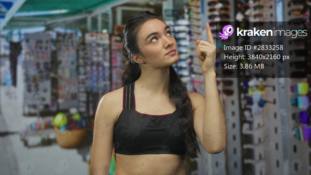 Young hispanic woman looking up and pointing finger to colorful sunglasses display in outdoor street market; curiosity discovery exploration inspiration. - Kraken Images