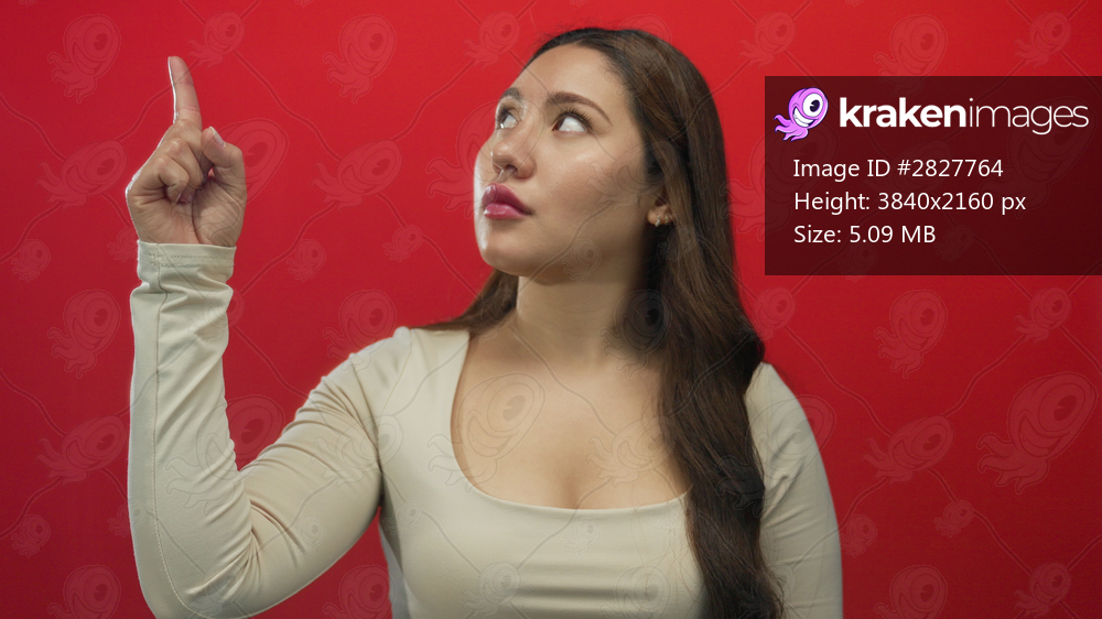 Young hispanic woman makes a clear thumbs down gesture with forward thumb and puckered lips against a vivid red studio wall; disapproval.