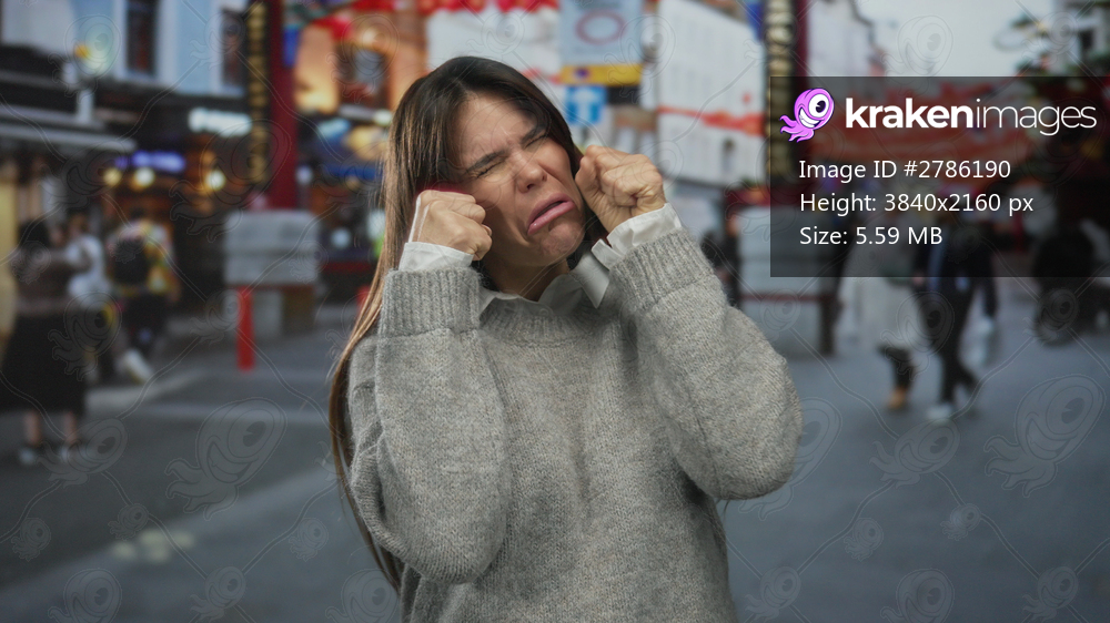 Young hispanic woman makes a playful crying gesture on a bustling city street with vibrant urban background and diverse people walking nearby.