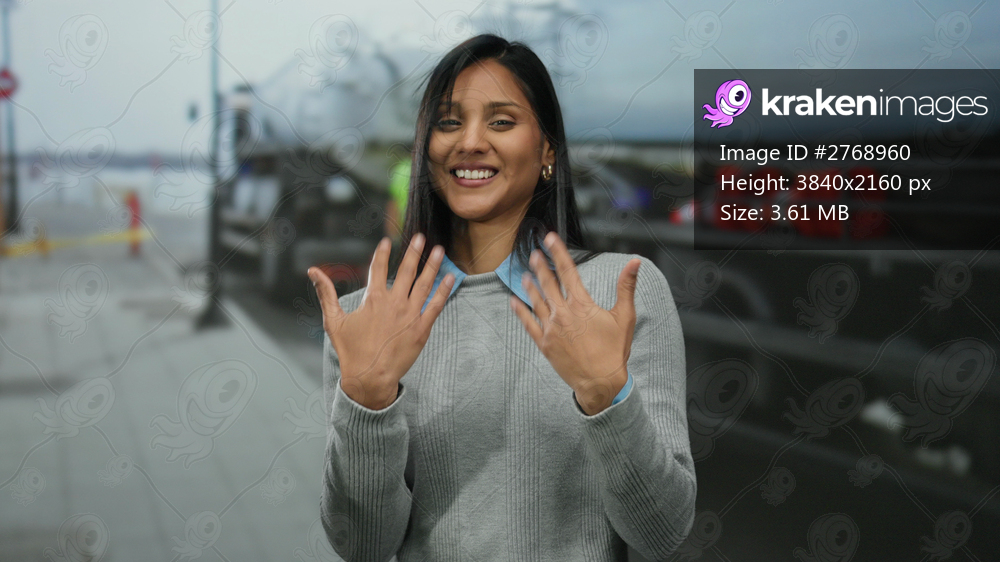 Young hispanic woman makes a welcoming hand gesture while smiling on a city street, surrounded by urban elements like a passing truck and blurred background. - Kraken Images