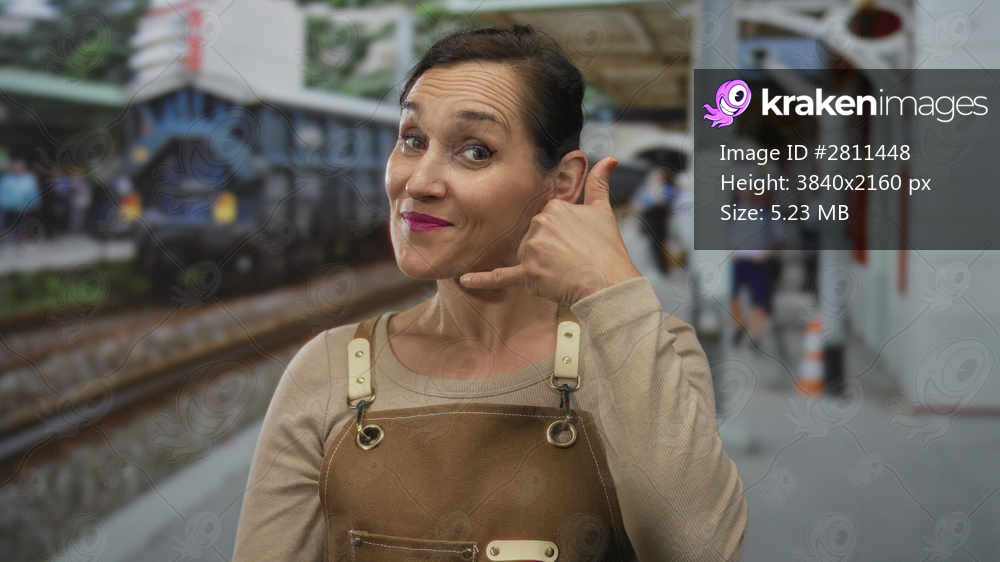 Young hispanic woman makes call me gesture with hand at train station; social connection communication invitation outreach.