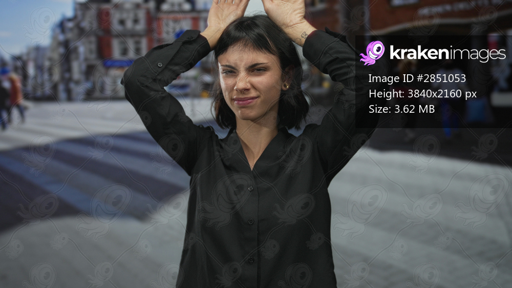 Young hispanic woman makes ear gesture with hands on head in urban street scene wearing black shirt; playfulness.