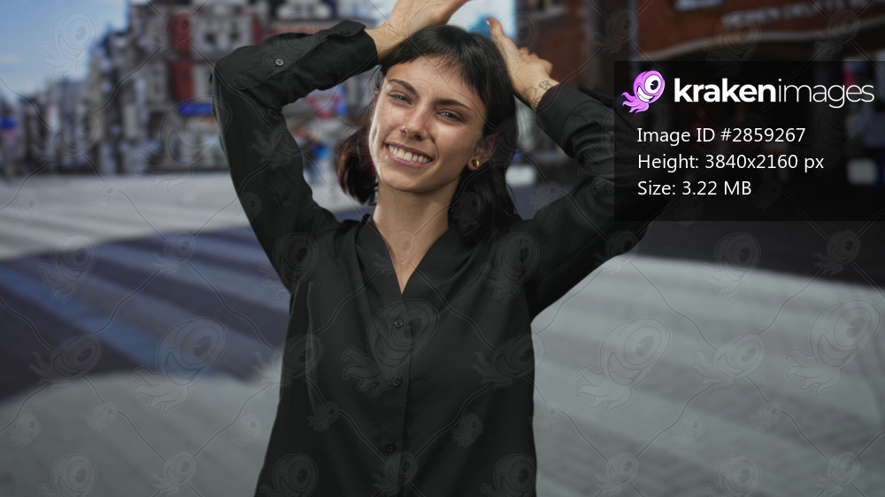 Young hispanic woman makes ear gesture with hands on head in urban street scene wearing black shirt; playfulness.