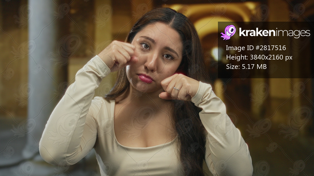 Young hispanic woman makes fists near eyes at historic building entrance in golden sunlight; sadness introspection.
