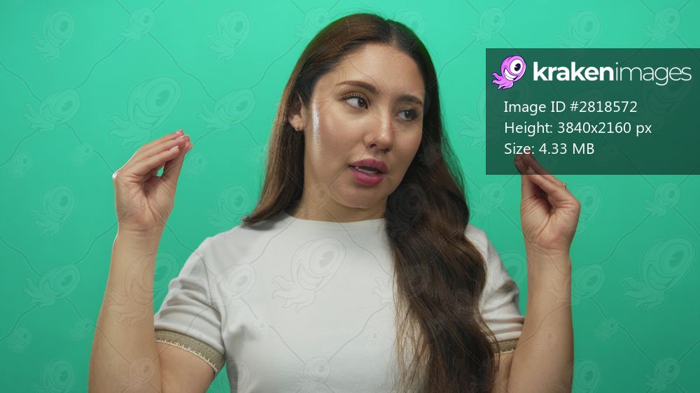 Young hispanic woman makes talking with hands gesture in a studio setting and directs gaze sideways; communication.