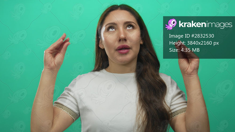 Young hispanic woman makes talking with hands gesture in a studio setting and directs gaze sideways; communication.