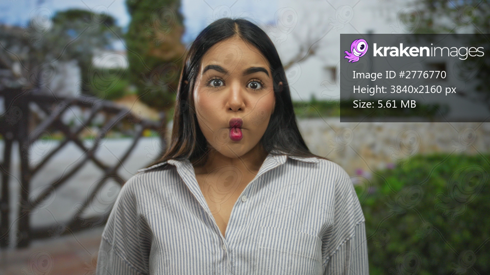 Young hispanic woman making a funny face outdoors in a garden with greenery and trees surrounding her in a casual striped shirt on a sunny day.