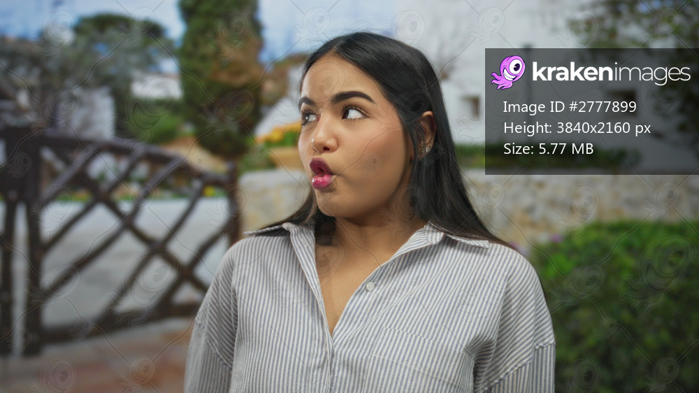 Young hispanic woman making a funny face outdoors in a garden with greenery and trees surrounding her in a casual striped shirt on a sunny day.
