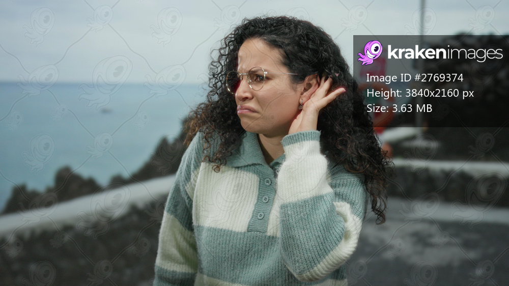 Young hispanic woman making a listening gesture with hand to ear on a seaside promenade with ocean and sky in the background, expressing curiosity and interest in the outdoor scene. - Kraken Images