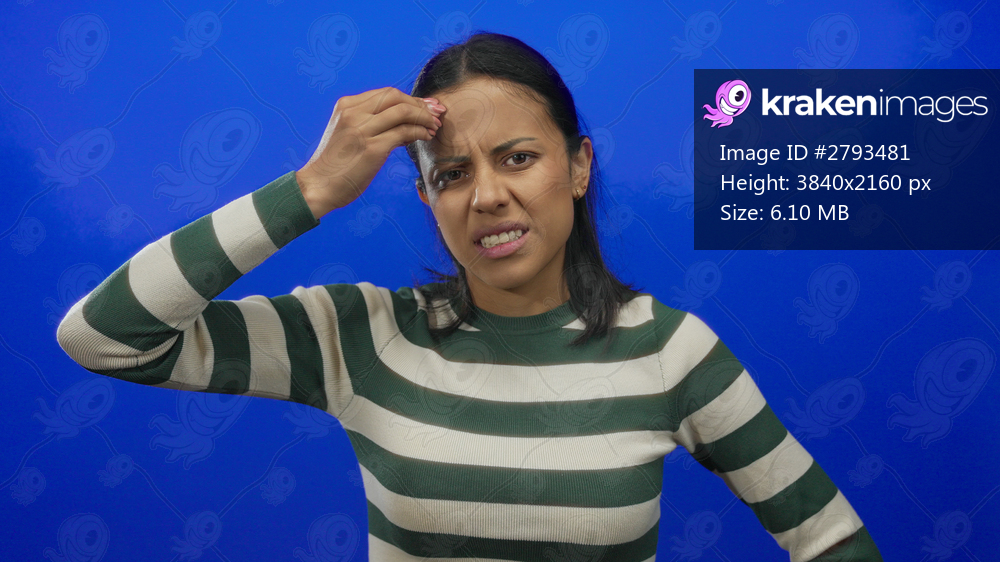 Young hispanic woman making a thoughtful expression against a blue background, wearing a striped sweater, conveying confusion and contemplation.