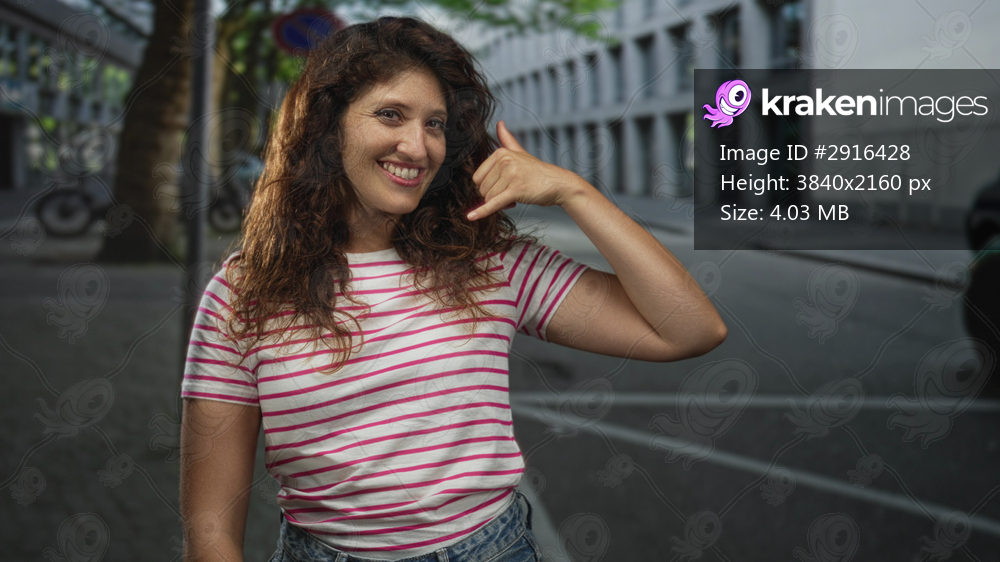 Young hispanic woman making call gesture with hand and smiling on a city street near parked car and tree; friendly connection.