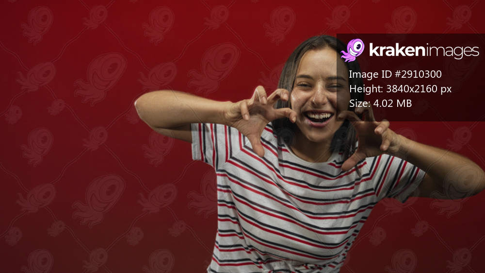 Young hispanic woman making claw hands and smiling in red studio wearing striped shirt; playful youthful fun.