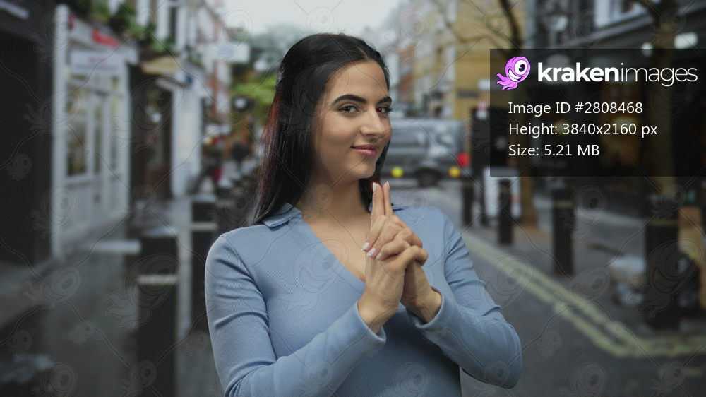 Young hispanic woman making finger gun gesture in outdoor urban street setting with expression of playfulness and confidence.
