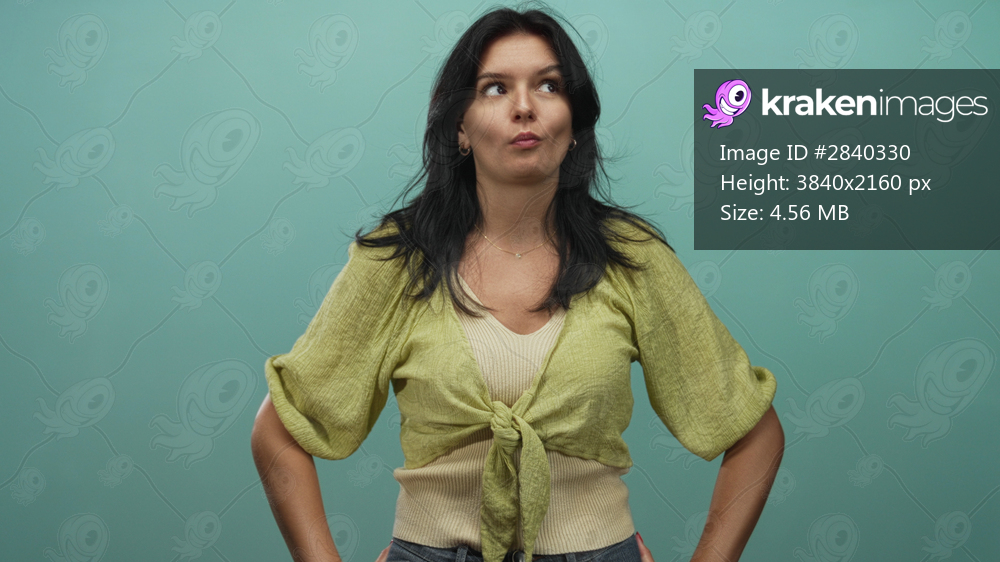 Young hispanic woman making fish face with hands on hips in studio teal background; playfulness humor.