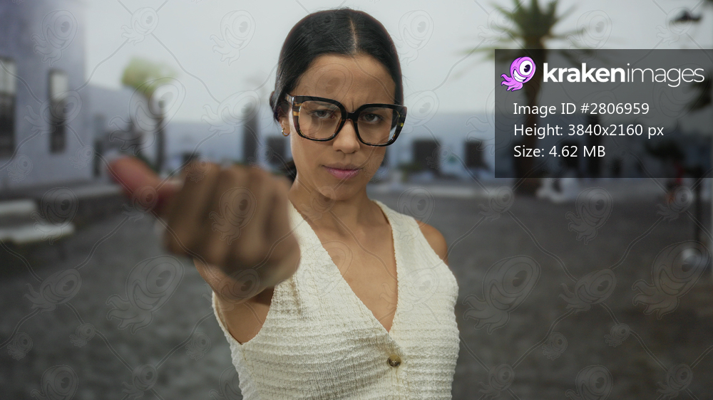 Young hispanic woman making gesture towards camera outdoors in sunny urban area with palm tree and traditional buildings in background.
