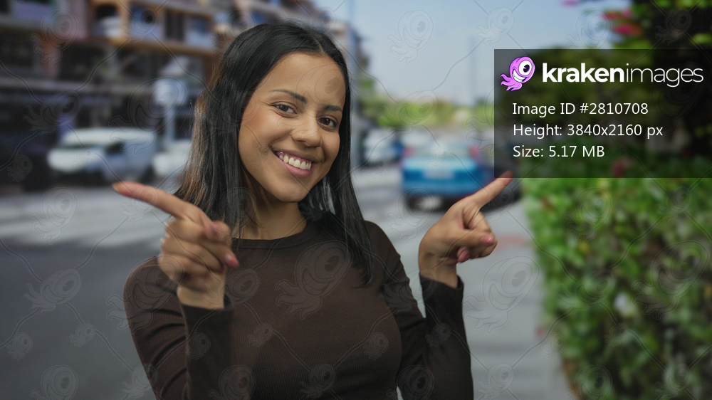 Young hispanic woman making heart shape with fingers while smiling on a busy city street, capturing a joyful outdoor urban scene.