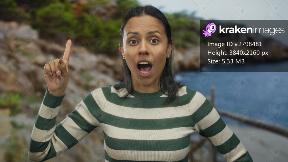 Young hispanic woman making idea gesture while standing on a scenic beach with a joyful expression, surrounded by the ocean and nature on a sunny outdoor day. - Kraken Images