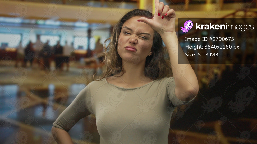 Young hispanic woman making loser gesture with hand framing an l shape on forehead in hotel building lobby; mockery.