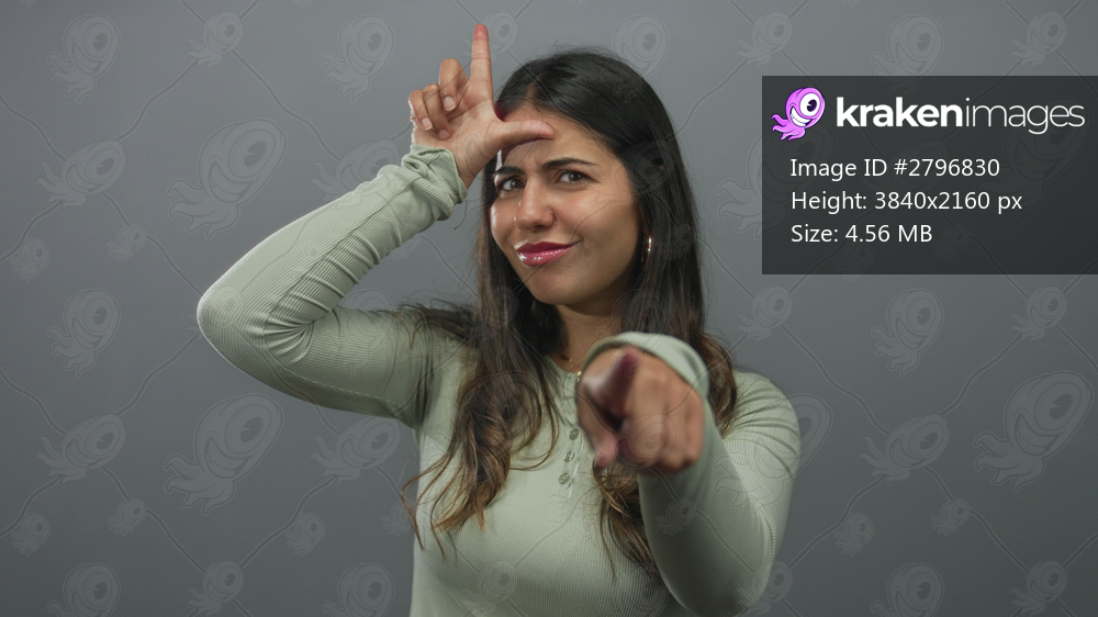 Young hispanic woman making loser gesture with hand on forehead against a grey wall in studio session; mockery.