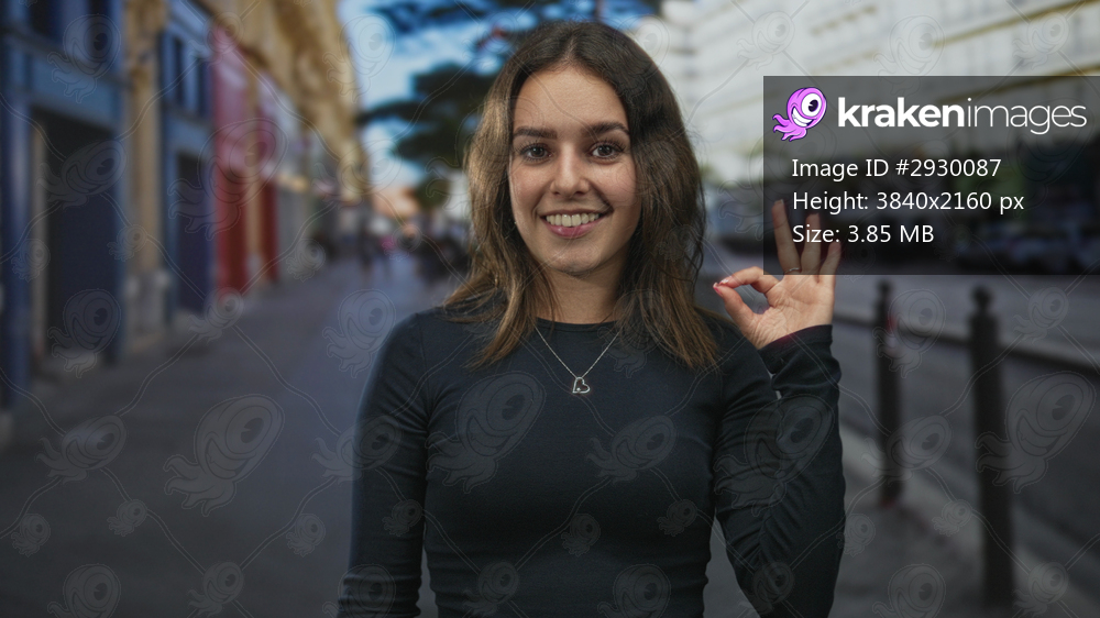 Young hispanic woman making ok hand gesture on a city street with heart necklace and smile; approval confidence warmth.