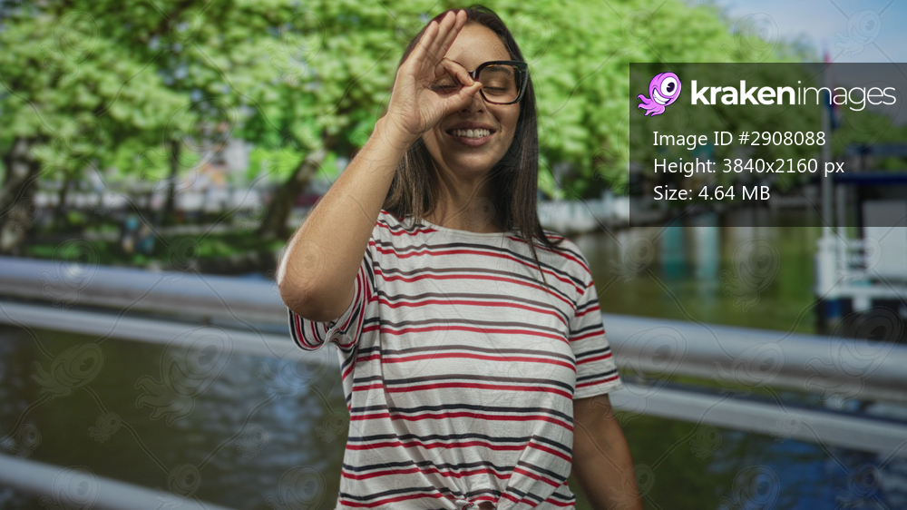 Young hispanic woman making ok sign with hand over eye on street bridge railing in amsterdam canal; playful joy.