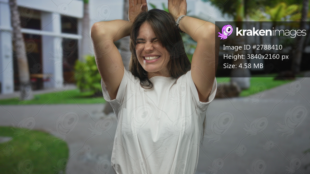 Young hispanic woman making playful bunny ears gesture on a vibrant city street, radiating joy and capturing the essence of carefree moments outdoors.