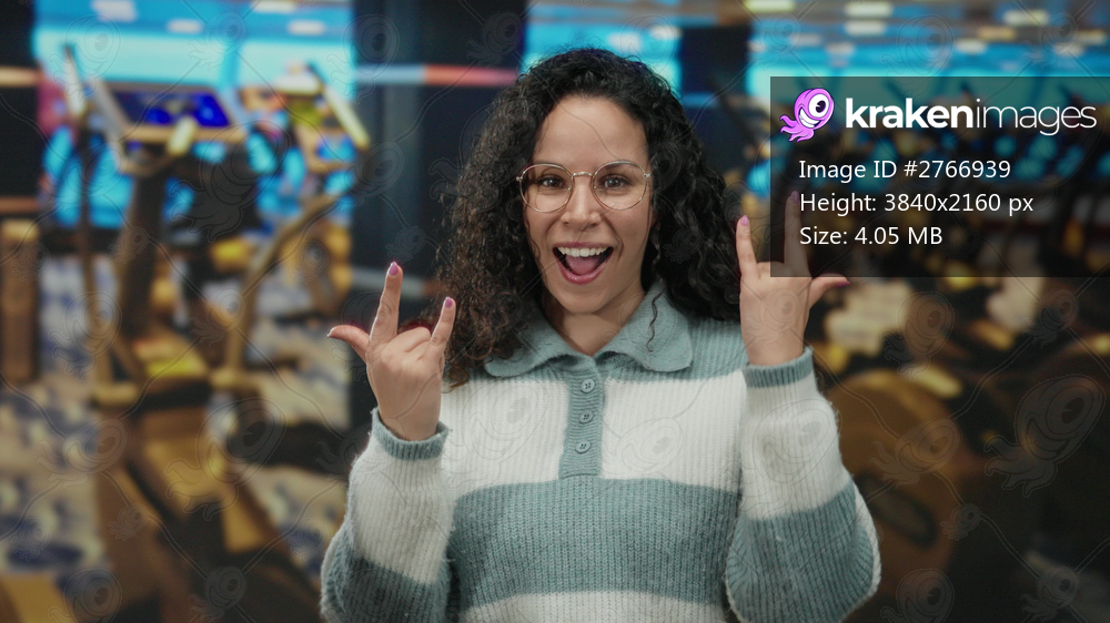 Young hispanic woman making rock gesture smiling in a gym with treadmills, wearing glasses and green sweater, capturing an energetic indoor moment.