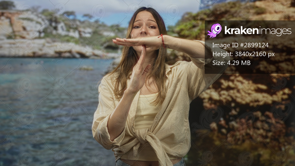 Young hispanic woman making time out sign with hands in studio by rocky seaside coast during daylight; calm pause reflection.