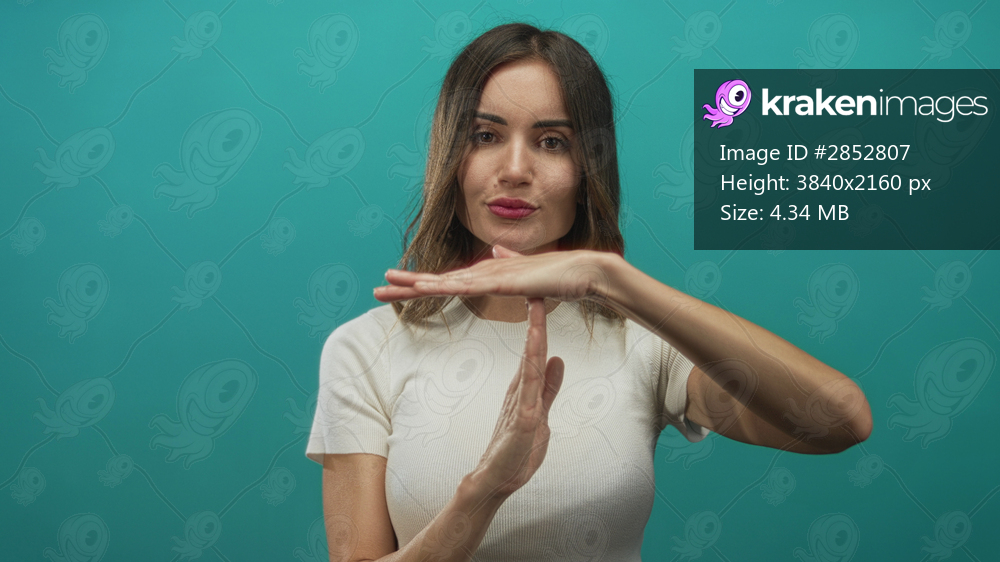 Young hispanic woman making timeout gesture with hands in teal studio set with centered posture; pause calm.
