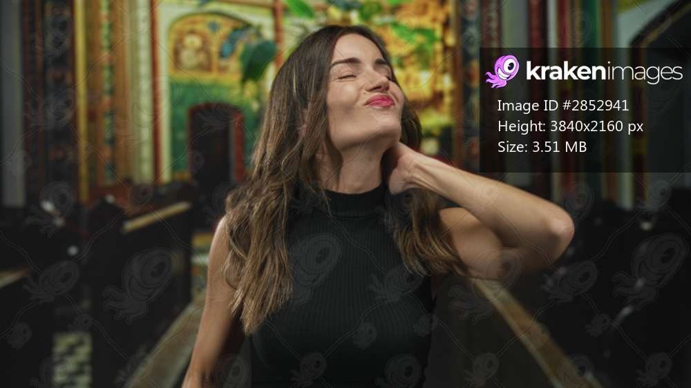 Young hispanic woman massages her neck with both hands while standing near a pew in a vaulted church building; tension.