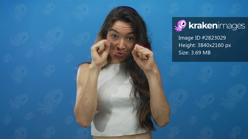Young hispanic woman mimics crying gesture with fists to cheeks in blue studio; sadness vulnerability empathy.