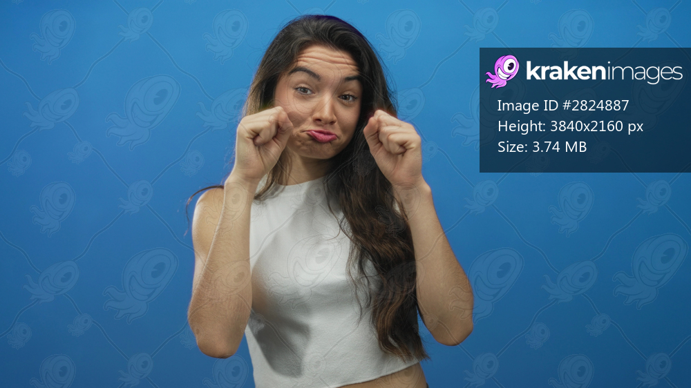 Young hispanic woman mimics crying gesture with fists to cheeks in blue studio; sadness vulnerability empathy.