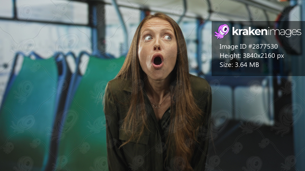 Young hispanic woman with mouth open gasping aboard city bus, leaning forward toward camera in olive green shirt and pendant necklace amid empty green seats; surprise travel. - Kraken Images